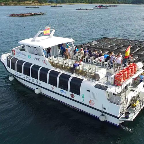 Descubre la Ruta de las Bateas en barco cada hora y media. Incluye degustación de mejillones y vino. Mínimo 10 personas.